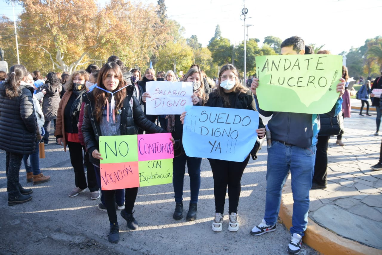 Los carteles dicen, “los gremios no nos representan”, “sueldo digno ya”, “soy autoconvocada”, “exijo un salario digno”,