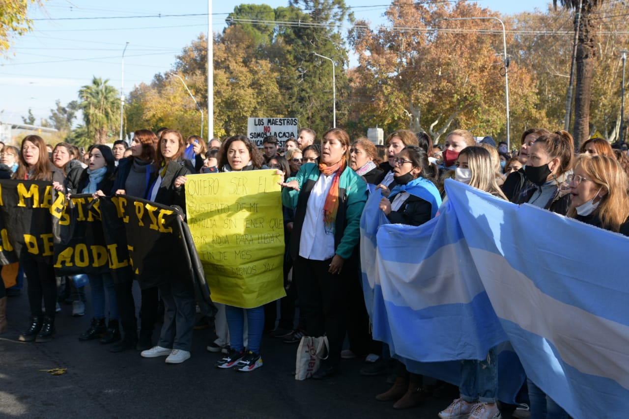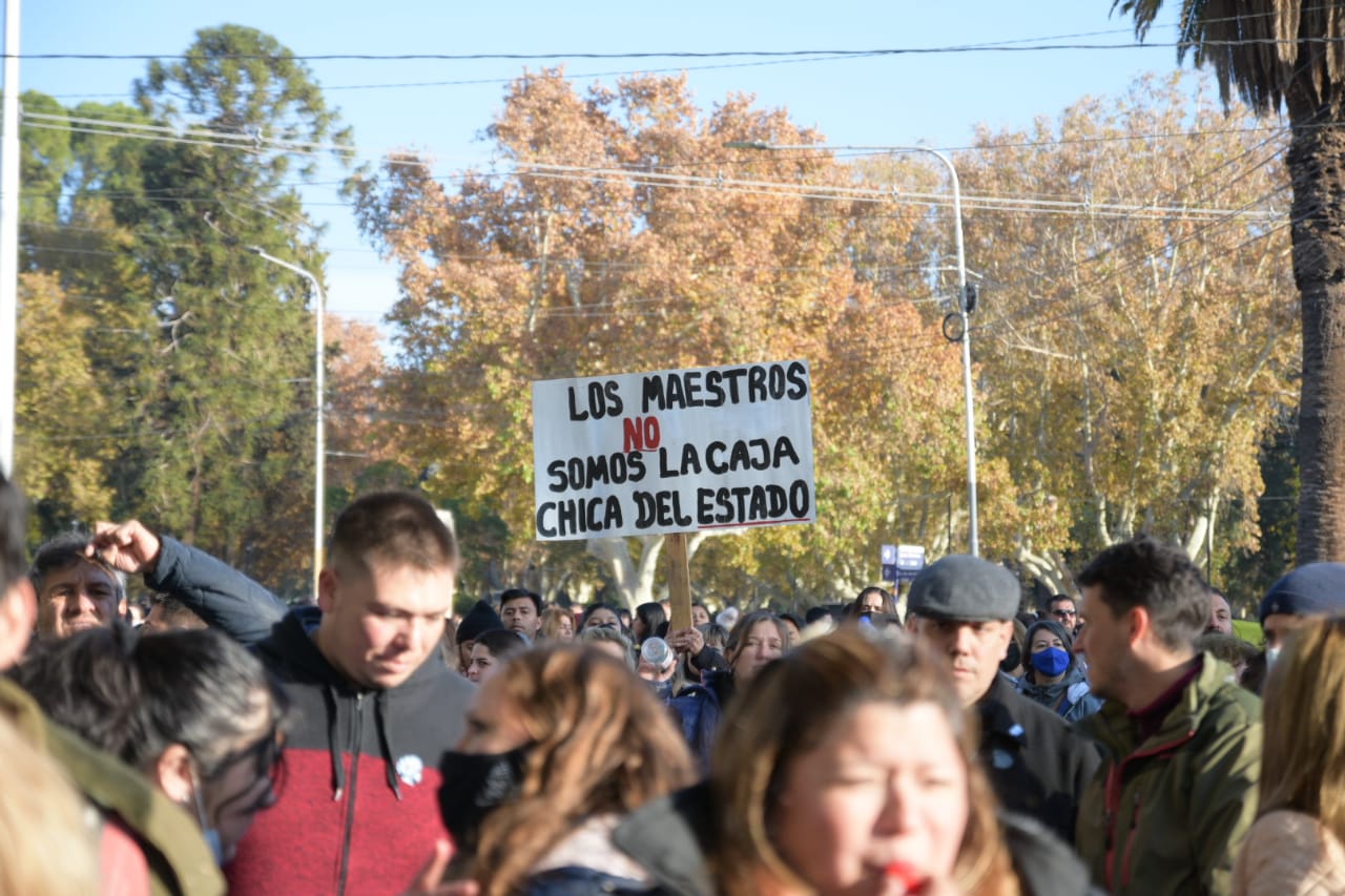 Hay banderas argentinas en las manos de los docentes y pancartas, la mayoría pidiendo por mejoras salariales, cuestionando a UDAP, UDA y AMET y al Gobierno.
