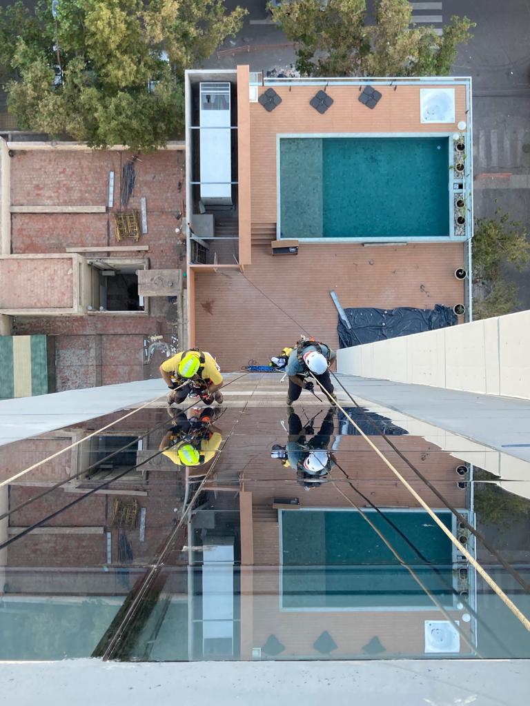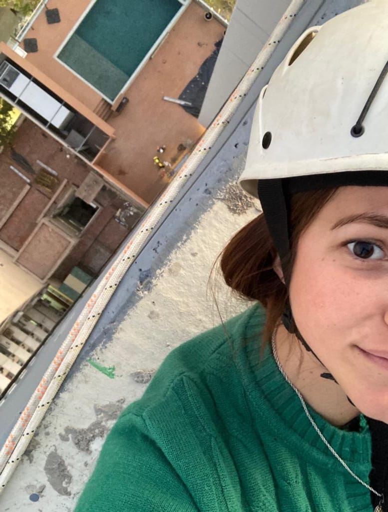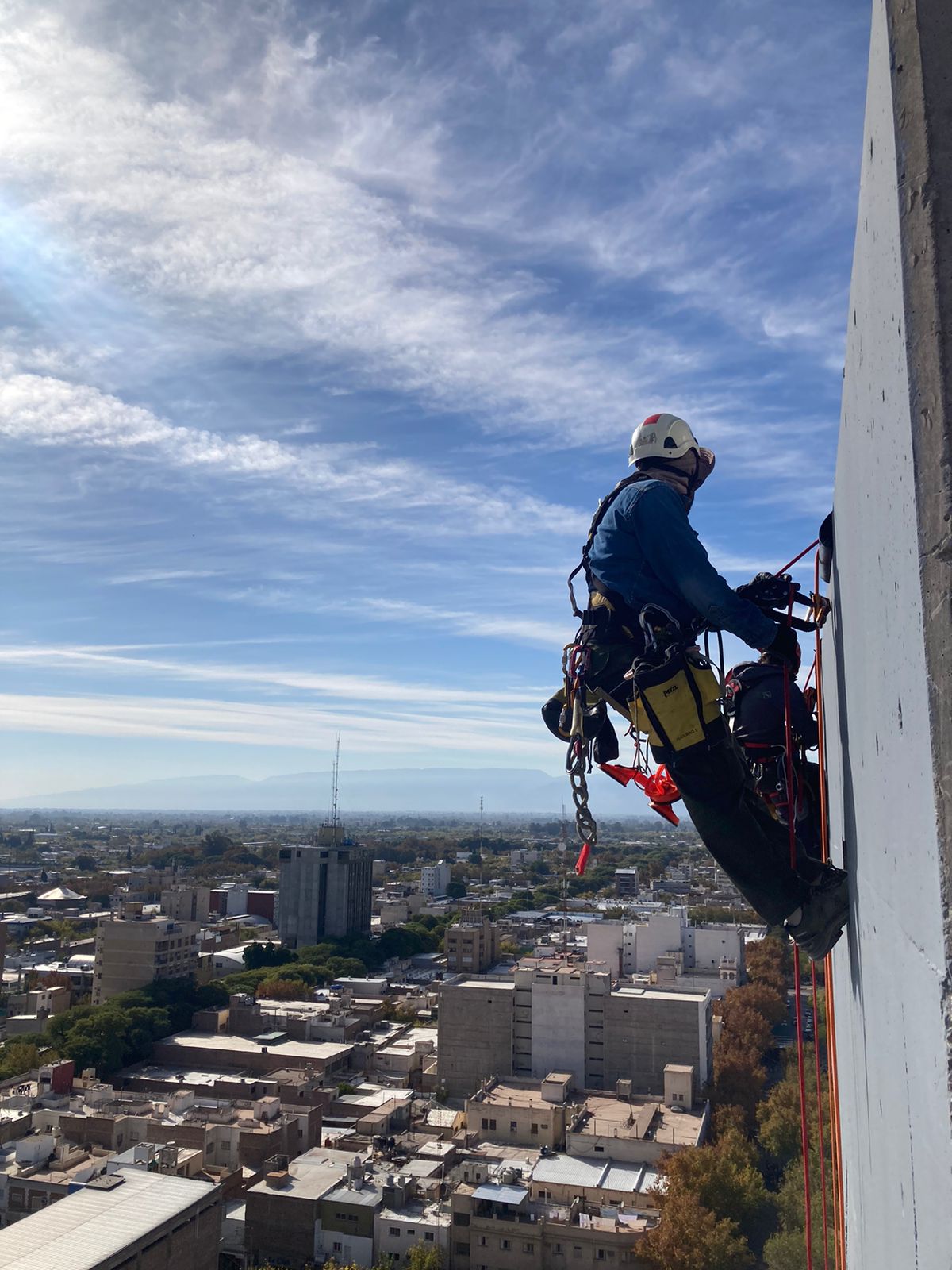 ¿Qué hacen? Todo lo que se refiera a trabajos en altura como limpieza de vidrios o trabajos de mantenimiento en acueductos, por ejemplo. Camila es técnica en Higiene y Seguridad para esa empresa y es quien controla que estén dadas las condiciones para dicha tarea: que los empleados cuenten con los EPP (elementos de protección personal) y es ella también quien verifica que el anclaje -es decir los soportes que van anclados a la pared para que puedan descender-, estén en condiciones.