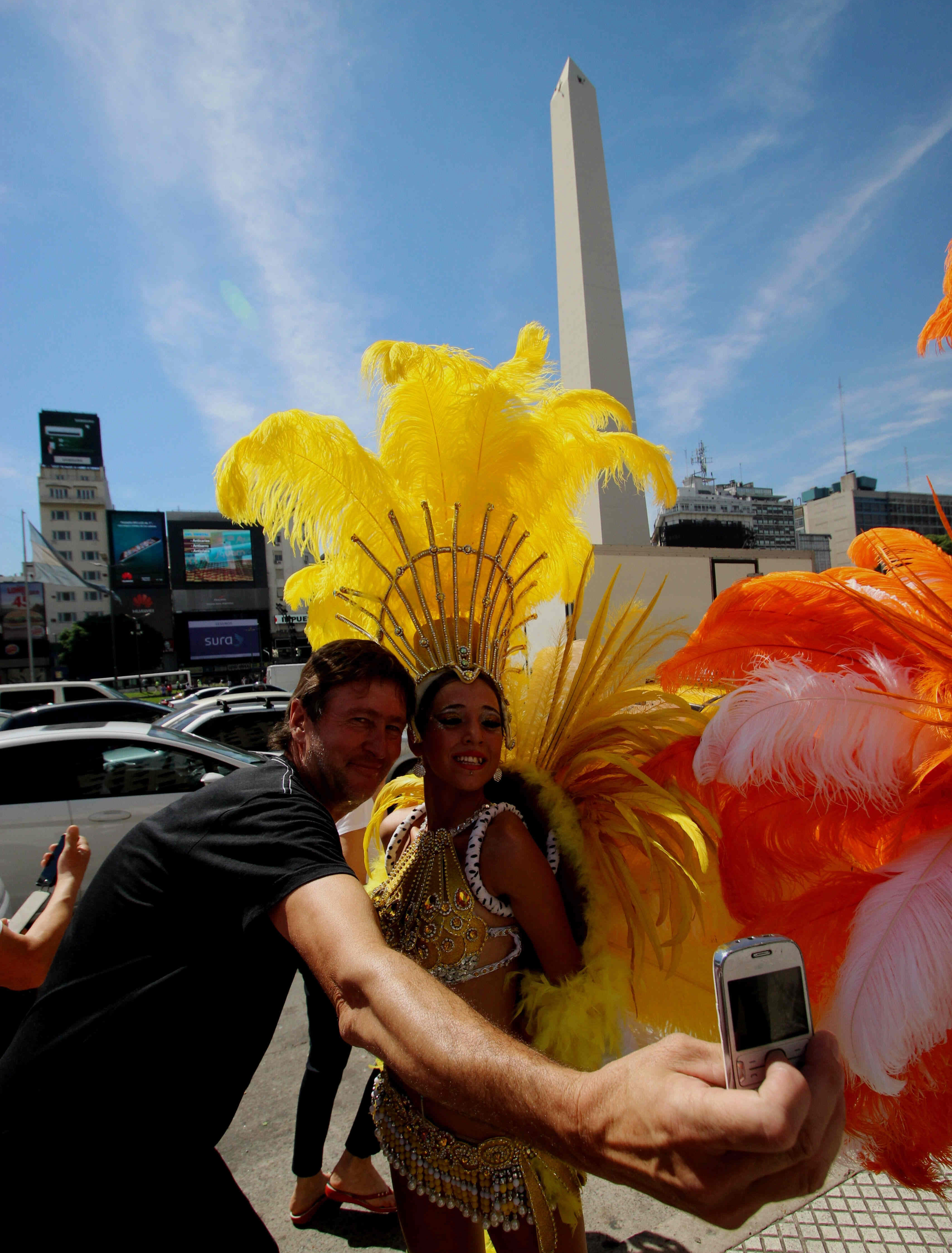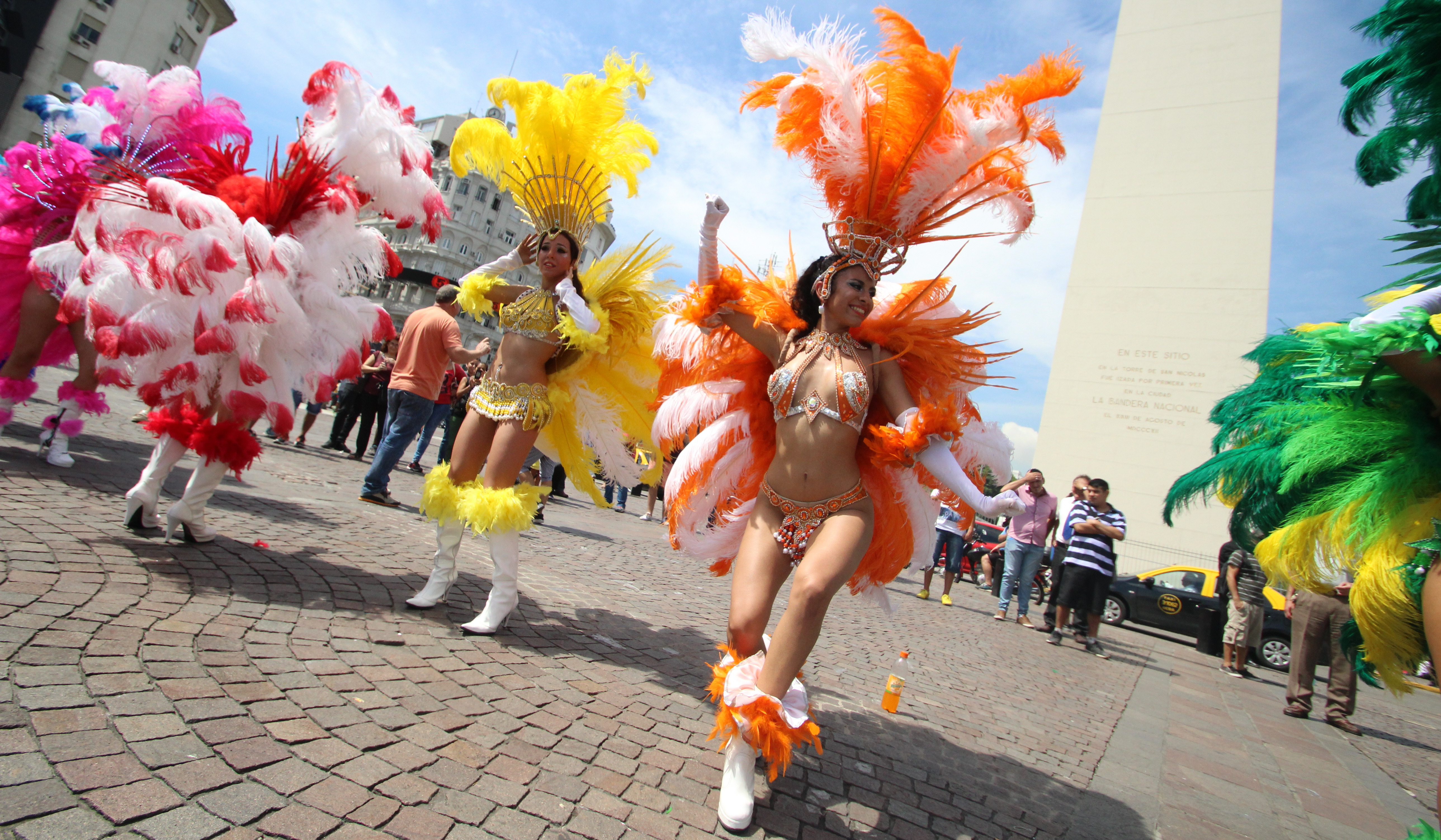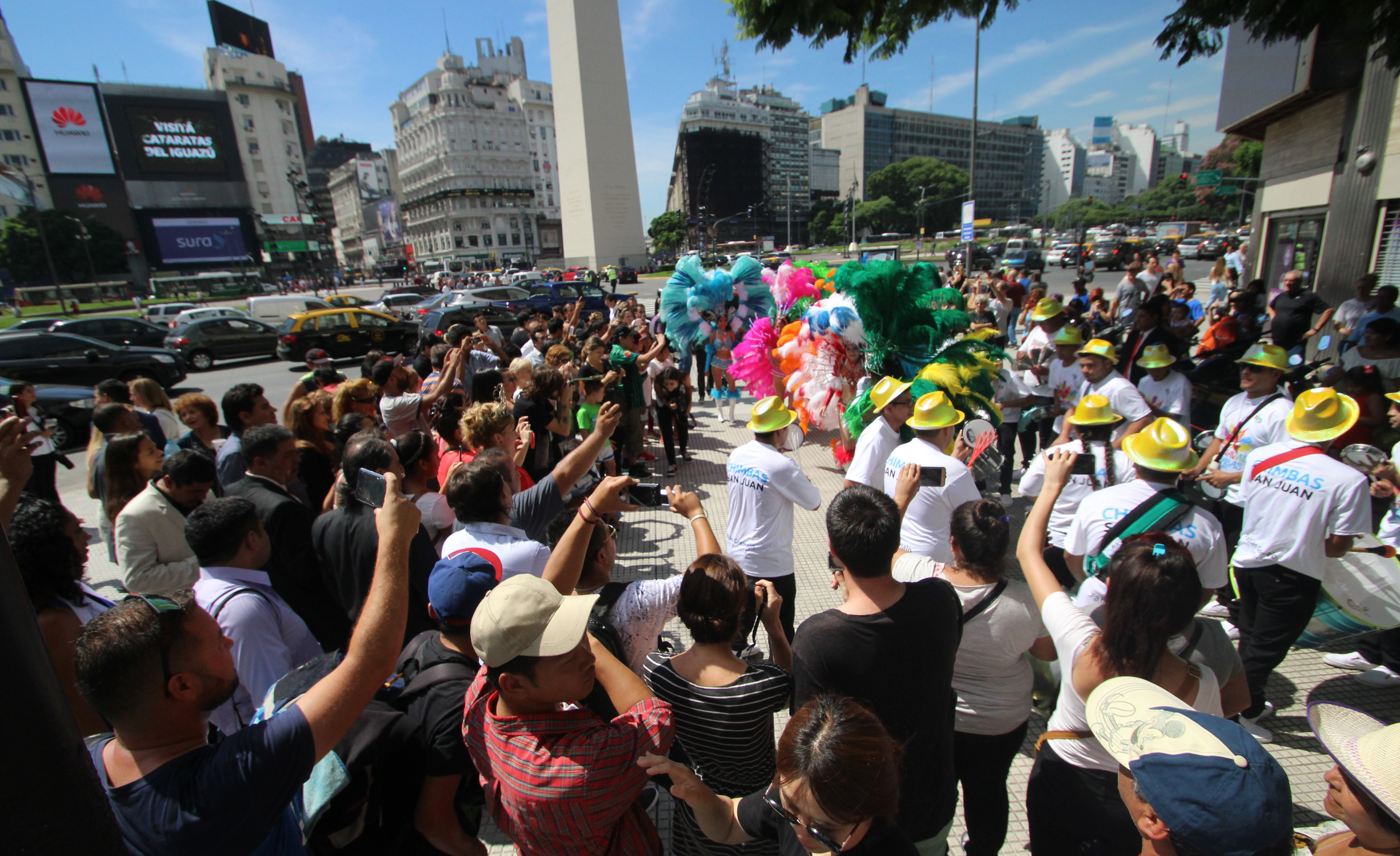 Buenos Aires amaneció como siempre: a máxima velocidad. Mucho tránsito, bocinazos y peatones corriendo para cruzar las calles. En esa locura, que se repite durante todo el día, el carnaval chimbero pisó fuerte. A tal punto, que a las 11, las plumas, el brillo de las lentejuelas y el resonar de los tambores de la batucada pusieron en pausa a todos los que pasaban por la zona del Obelisco.