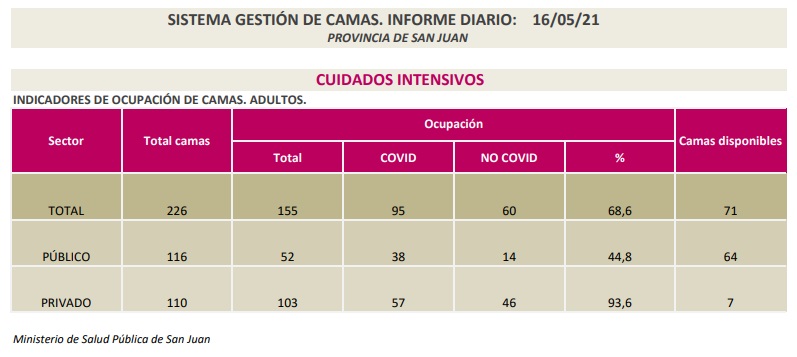 Desde el Ministerio de Salud brindaron un informe detallado de la cantidad de camas disponibles en San Juan, asegurando que en la parte pública es del 44,8%.