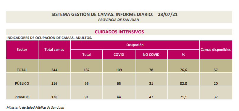 Además, se encuentran internados 199 pacientes en las áreas de COVID-19 (entre positivos y sospechosos) de los hospitales Dr. Guillermo Rawson; Dr. Marcial Quiroga; Dr. Ventura Lloveras, de Sarmiento; Dr. César Aguilar, de Caucete; Dr. José Giordano, de Albardón; Dr. Federico Cantoni, de Pocito; CEMEC; Dra. Julieta Lanteri; Hospital San Roque, de Jáchal; Hospital Dr. Alejandro Albarracín, de Valle Fértil; Hospital de Barreal, de Calingasta; Hospital Privado; Instituto Médico; Clínica El Castaño; Clínica Santa Clara; Sanatorio San Juan y CCI.