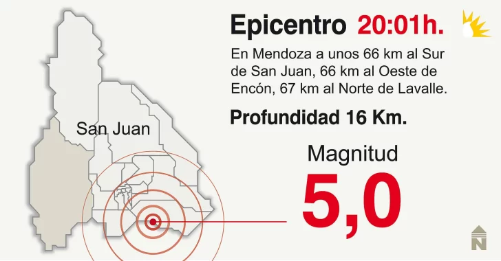 El movimiento telúrico ocurrió a 66 kilómetros al Sur de la capital, a 66 kilómetros al Oeste del Encon y a 67 kilómetros al Norte de la localidad de Lavalle, de la vecina provincia, según indica el Instituto Nacional de Prevención Sísmica.