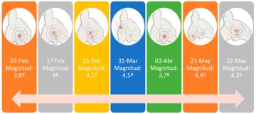 Mientras tanto, el segundo temblor de mayor magnitud se percibió justamente ayer, a las 3,03, y su Magnitud fue de 4,4 grados, aunque la profundidad fue mucho mayor, se produjo a 109 km.