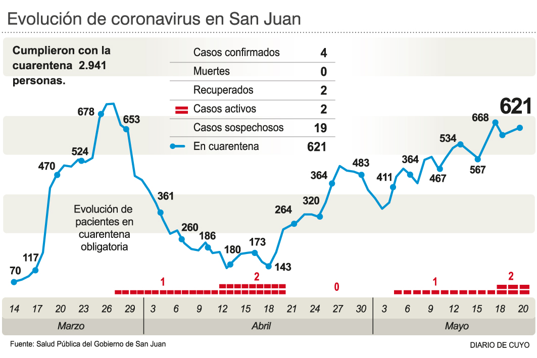 Por otro lado, hay 19 casos sospechosos a la espera de resultados, 159 negativos y 621 personas en cuarentena, según el parte de Salud Pública.