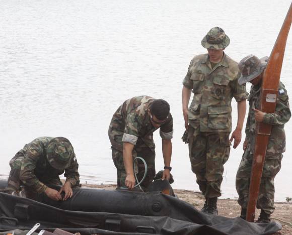 En la carrera contra el tiempo los nervios se hicieron sentir cuando a una de las brigadas le tocó armar dos botes de goma. Bajo el calor del mediodía, se turnaban para presionar los fuelles para armar las balsas y encajar las placas que formaban su piso. Una hora después, los participantes se subían a las balsas y comenzaban a bordear el lado oeste del dique para poder llegar a un punto que es inaccesible por tierra.