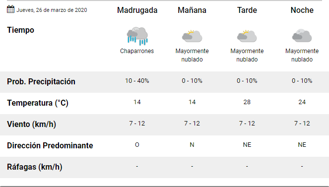 Las primeras horas del jueves se presentan inestables con probabilidad latente de chaparrones aislados, mejorando por la mañana. El cielo estará mayormente nublado.