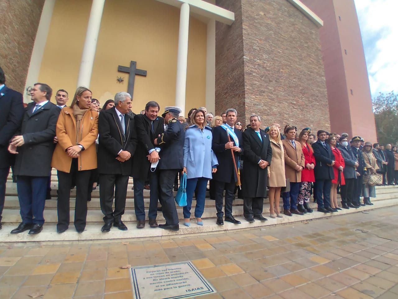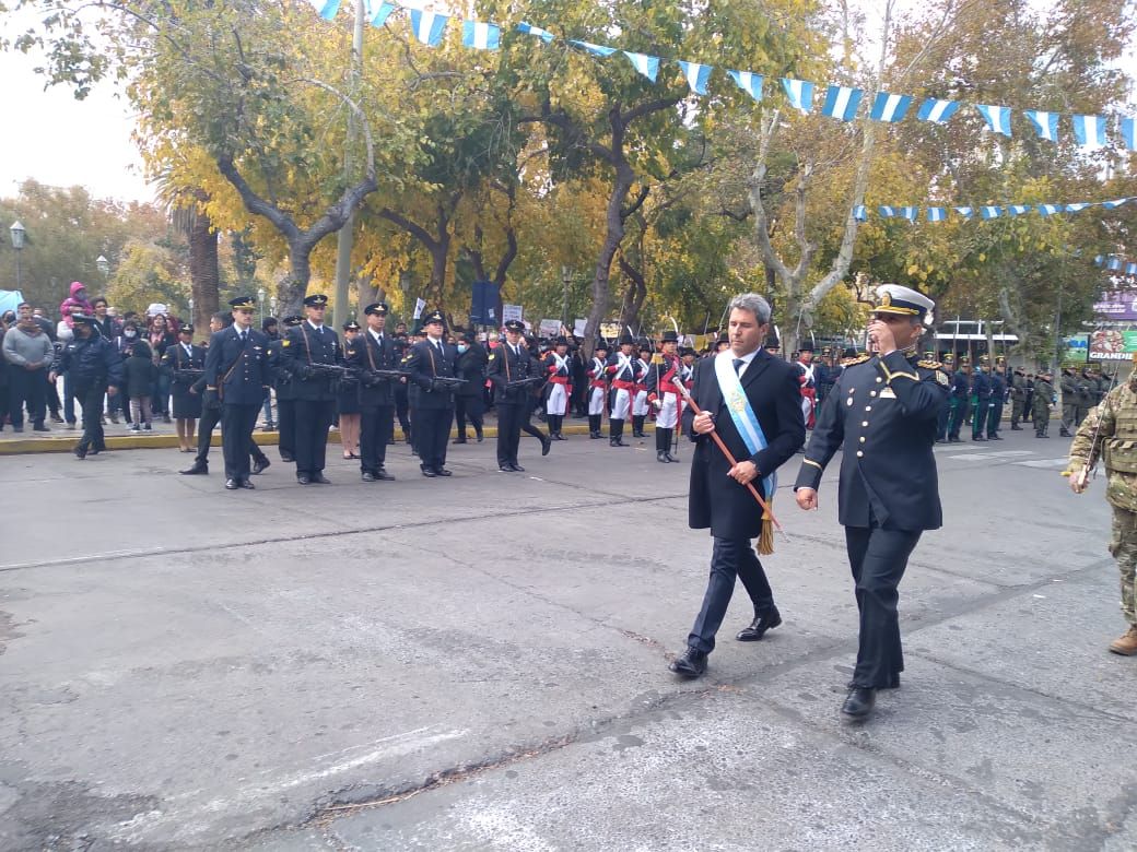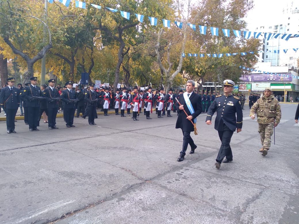 Tal como indica la tradición de los actos por el 25 de Mayo, el gobernador Sergio Uñac saludó a las tropas y fuerzas de seguridad de la provincia antes del ingreso a la Catedral para ser parte del Tedeum.