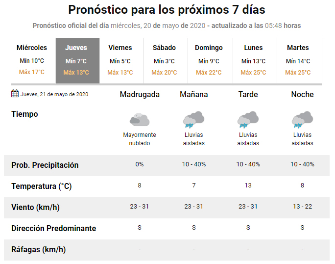 Para hoy se espera viento del sector Sur, con una velocidad de entre 23 y 31 kilómetros por hora, y cielo mayormente nublado.