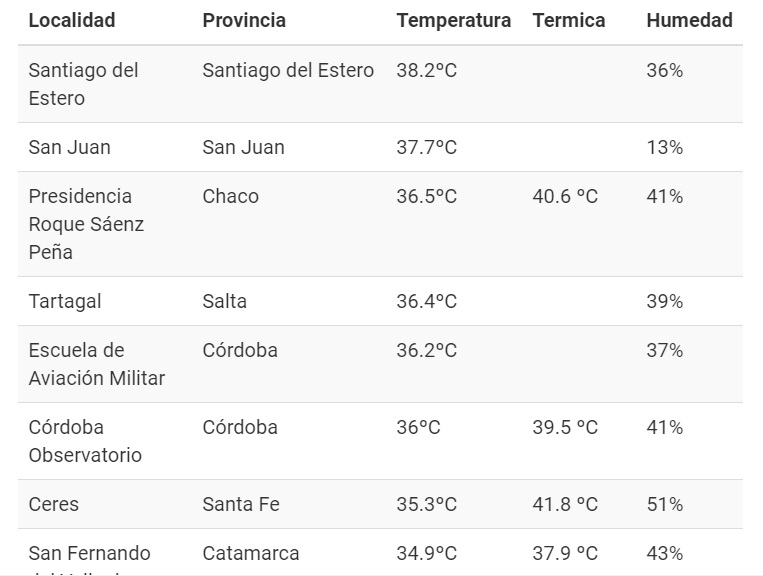 Con 37.7°C, San Juan estuvo segunda en el ranking de las ciudades más calurosas del país. En primera posición estuvo la capital de Santiago del Estero con 38.2°C.