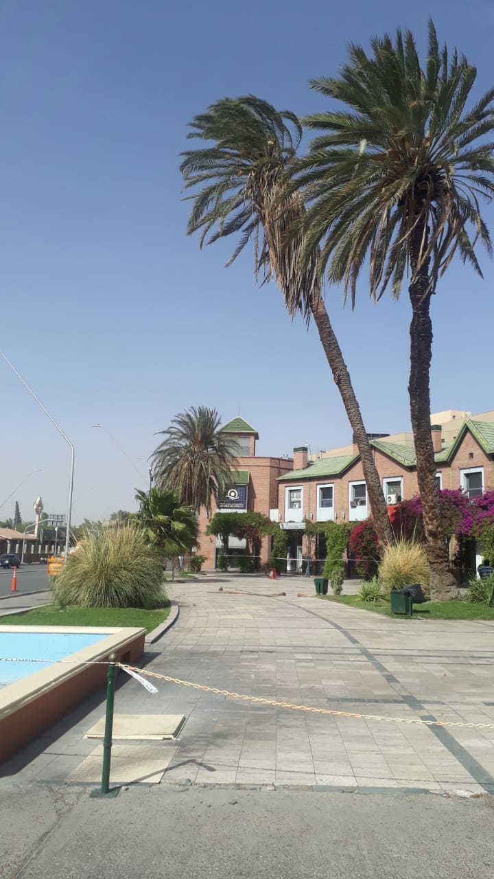 Este sábado las fuertes ráfagas del Sur provocaron que algunas ramas se desprendieran de los árboles y hasta hubo ejemplares que quedaron a punto de derrumbarse. Es el caso de la palmera que está ubicada en el ingreso al shopping ubicado en avenida Ignacio de la Roza y Del Bono, en Capital.