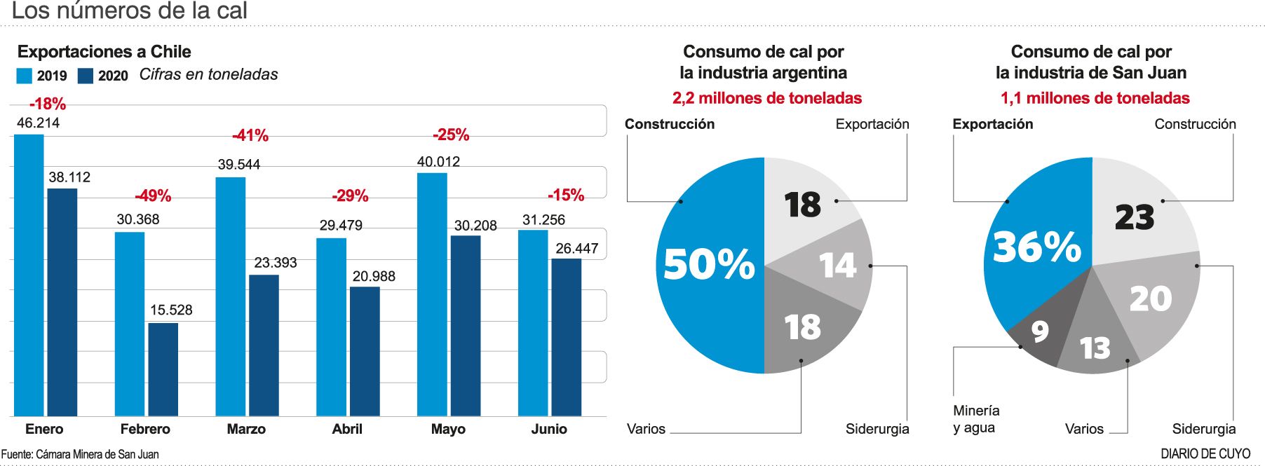 La industria de las cales también tuvo su impacto por efecto del Covid-19, al punto que la exportación a Chile, que representa el 36% de la producción sanjuanina, tuvo una caída en el primer semestre del año del 29%, pero con el regreso paulatino de la actividad en el sector estiman llegar a fin de año casi con el mismo volumen de producción del año pasado, que alcanzó las 1.100.000 toneladas. "Nos estamos recuperando y vamos a estar cerca", dijo Raúl Cabanay, vicepresidente de la Cámara Minera de San Juan y gerente general de Caleras San Juan.