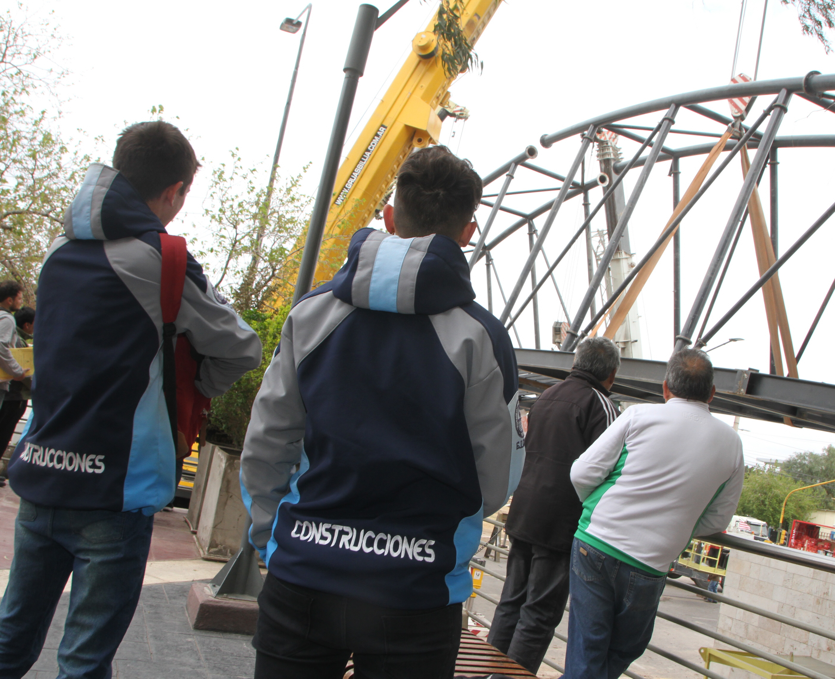 La construcción del puente de hierro, con estilo de los que se usaban para los ferrocarriles, se hizo en el Parque Industrial de Albardón. Luego fue trasladado en partes hasta donde se acaba de colocar. Los operarios tuvieron que unir todas las piezas al ras del suelo, algo que les llevó poco más de una semana. Desde el sábado pasado comenzó la tarea de elevar la estructura que fue diseñada para ser armada en dos tramos. En un primer momento se dijo que el puente iba a estar listo el pasado 11 de septiembre, sin embargo hubo problemas con la grúa y la tarea que en principio duraría 30 horas, se extendió. Sin embargo, ayer, a contra reloj, los operarios trabajaron desde temprano. Lo hicieron como si estuviesen en un enorme escenario donde fueron observados atentamente por la gente que pasaba por el lugar y se paraba para tomar fotos.