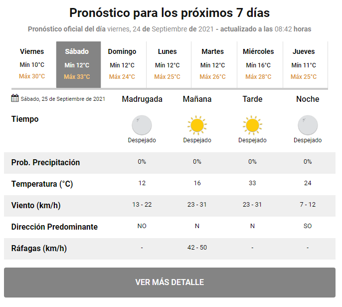 Cabe recordar que, para este viernes está pronosticada una temperatura máxima de 30 grados con el cielo despejado y se prevé la llegada del viento desde el sector Noroeste para la noche.