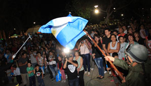 San Juan, 2 de abril.- La Plaza España fue escenario de un nuevo homenaje a los excombatientes y caídos en la Guerra de Malvinas. Durante la velada se presentaron distintos artistas, pero el momento de mayor emoción se vivió cuando la Banda de Música del RIM 22 interpretó el Himno Nacional Argentino.