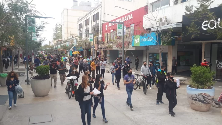 Los trabajadores hicieron público su malestar y marcharon por distintos puntos del microcentro, solicitando el regreso del horario de corrido porque, según afirman, les permite tener más tiempo libre y también evitar cuatro pasajes de colectivo, en lo que es un riesgo de posibles contagios y también un golpe al bolsillo en medio de la crisis económica.