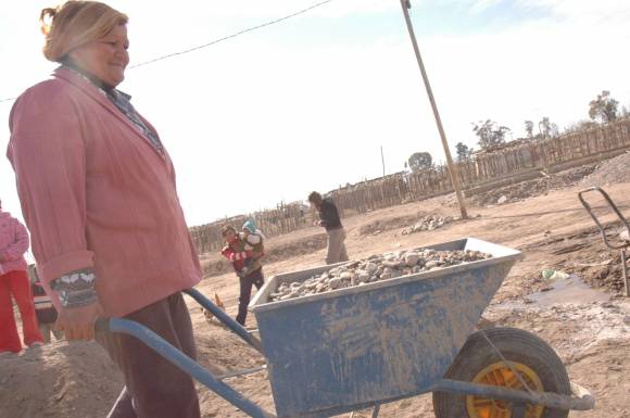 La postal impacta desde la ruta. Una mujer carga ripio en una carretilla. Otra empareja el cemento del piso como si toda su vida se hubiese dedicado a la albañilería. La más joven del grupo, casi a punto de dar a luz, les ceba un mate para calentar el cuerpo. Ni bien empieza a aclarar el día, una veintena de mujeres cauceteras empieza a trabajar para dejar a punto las plataformas donde colocarán las casas de emergencia. Y aunque el trabajo es duro y generalmente lo hacen los hombres, a ellas no se les borra la sonrisa del rostro. Es porque están a punto de ver hecho realidad un sueño: tener un techo propio después de vivir en carpas desde el 2006 porque una inundación las dejó en la calle.