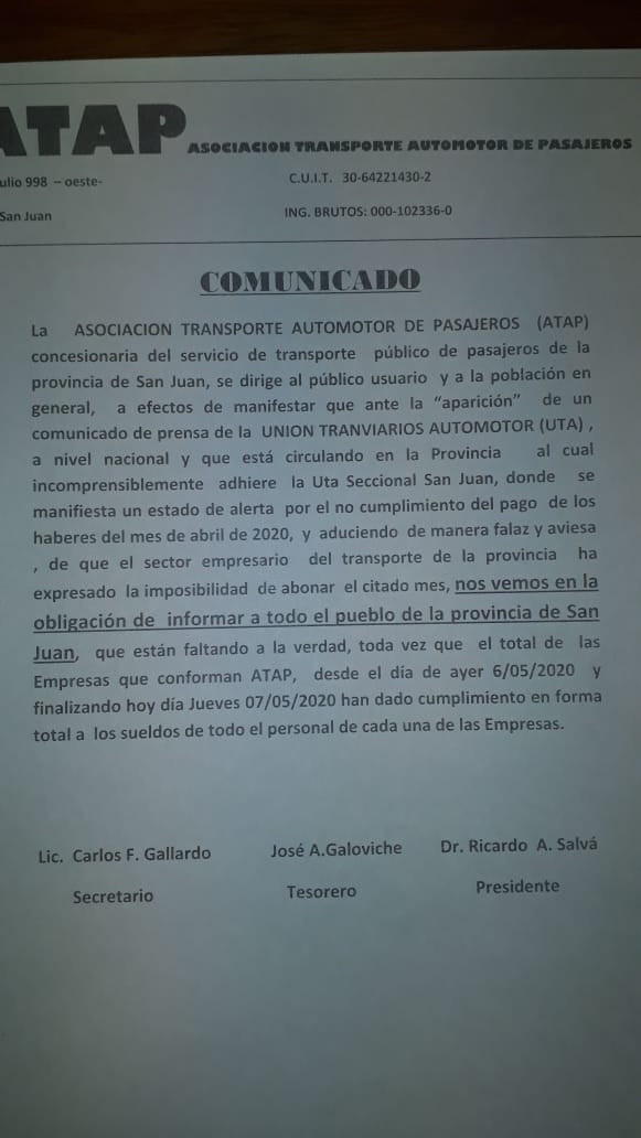 A continuación, en el escrito aseguraron que "desde ayer y hasta este jueves, las empresas que conforman ATAP han dado cumplimiento en forma total a todo el personal".