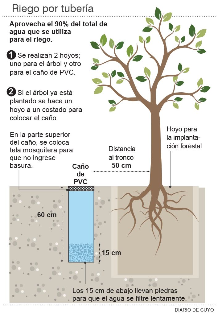 Molina explicó que para llevar adelante este sistema de riego personalizado se entierra cerca del árbol un caño de pvc de 60 centímetros de largo por unos 15 de diámetro, que se llena de agua que se filtra lentamente a través de piedras (ver infografía). Y que en el mismo entran unos 3 litros de agua, suficientes para mantener el árbol hidratado y sano. Mientras que con el riego de la taza con el camión cisterna, se utiliza como mínimo 10 litros por el diámetro de la manguera y la fuerza con que sale el agua, aunque este riego dure sólo segundos. Sostuvo que con el nuevo método se ahorra hasta un 70% de agua y su uso es altamente efectivo, ya que no hay evaporación.