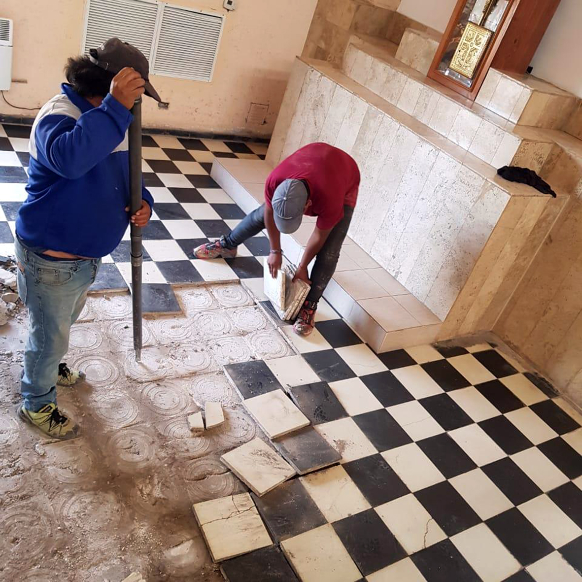 La primera etapa de la obra de remodelación incluye, además del reemplazo del piso, la instalación de carpintería nueva de ventanas y puertas, renovación de la instalación eléctrica y del sonido, y revestimiento de los altares laterales. Y se calcula que en un mes y medio o dos estará lista.