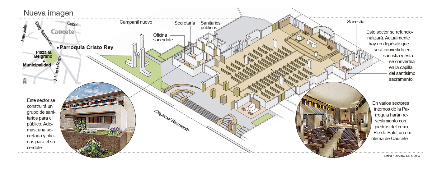 Desde hace unos días los feligreses de la villa cabecera de Caucete tienen que trasladarse hasta la Escuela José Chirapozu para participar de las misas. Y así deberán hacerlo por dos meses más. El fundamento: ya arrancó la primera etapa de remodelación de la Iglesia Cristo Rey y el templo permanecerá cerrado durante ese tiempo. La remodelación del edificio incluye desde el cambio del piso interior hasta la construcción de un campanil.