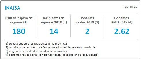 Según los datos del Inaisa difundidos por el Incucai, actualmente en la provincia 180 personas están en lista de espera para recibir un órgano. Mientras que, en lo que va de 2018, 24 sanjuaninos recibieron órganos de donantes cadavéricos y hubo 11 donantes reales (personas que fallecieron y se pudo completar el proceso) originados en centros de salud sanjuaninos.