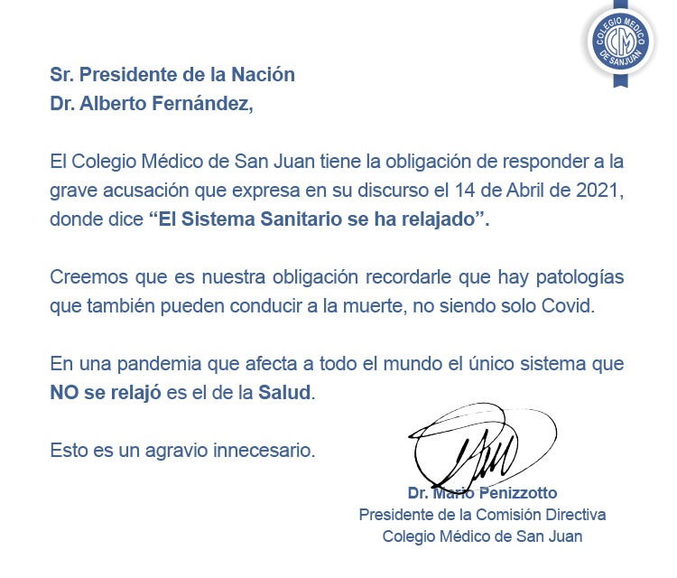 El Colegio Médico también salió al cruce: "Es un agravio innecesario"