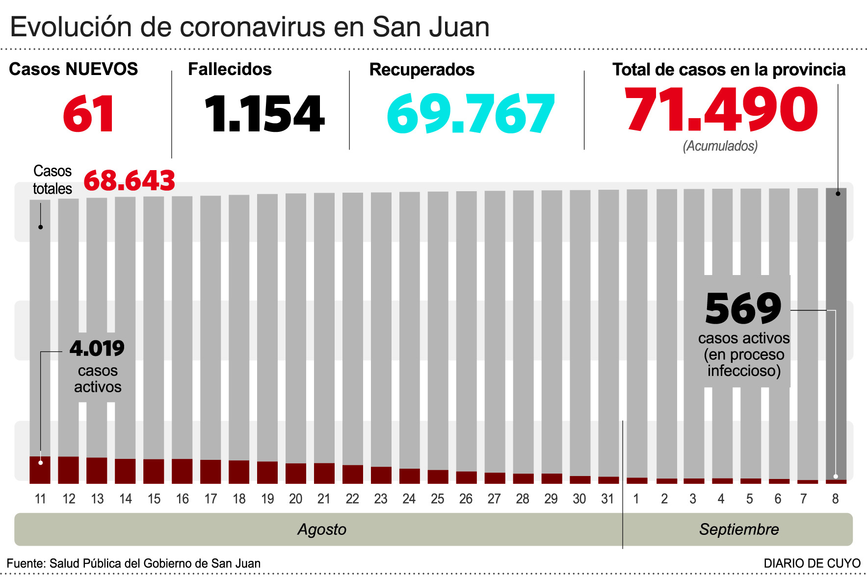 A lo largo del último mes, en tanto, hubo más de 7.300 sanjuaninos que lograron el alta, frente a poco más de 3.400 que fueron confirmados como nuevos casos de covid. La brecha ha seguido ampliándose y de hecho en la provincia desde hace varios días que la cantidad de positivos detectados cada 24 horas no llega a los tres dígitos en ese casillero.