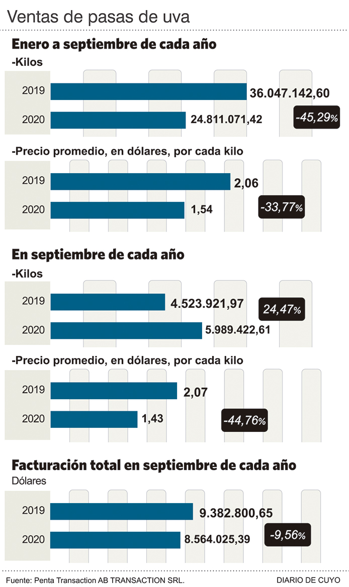 Un informe publicado en agosto por este diario reveló que los envíos al exterior de las pasas sanjuaninas habían mermado, en el período de enero a julio, un 17,44%. Ahora los datos hasta septiembre dan cuenta de que la reducción casi se triplicó porque llegó al 45,29%, según datos del sector. Y la razón es la caída de negocios con el mercado brasileño, el principal comprador, como consecuencia del impacto en la economía del vecino país por la pandemia. Frente a este panorama, algunos anticipan que podrían quedar pasas sin vender para el año próximo, lo que no ayudará a que los precios se recuperen.