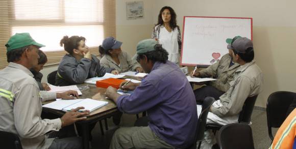 Las clases, que los operarios deben tomar obligatoriamente, se dictan 3 veces por semana. Hay 2 grupos. Uno estudia dentro del plan Fines, está integrado por 19 personas que no terminaron el ciclo primario. El otro, integrado por 17 personas que no saben leer ni escribir, está inserto en el Programa de Alfabetización.