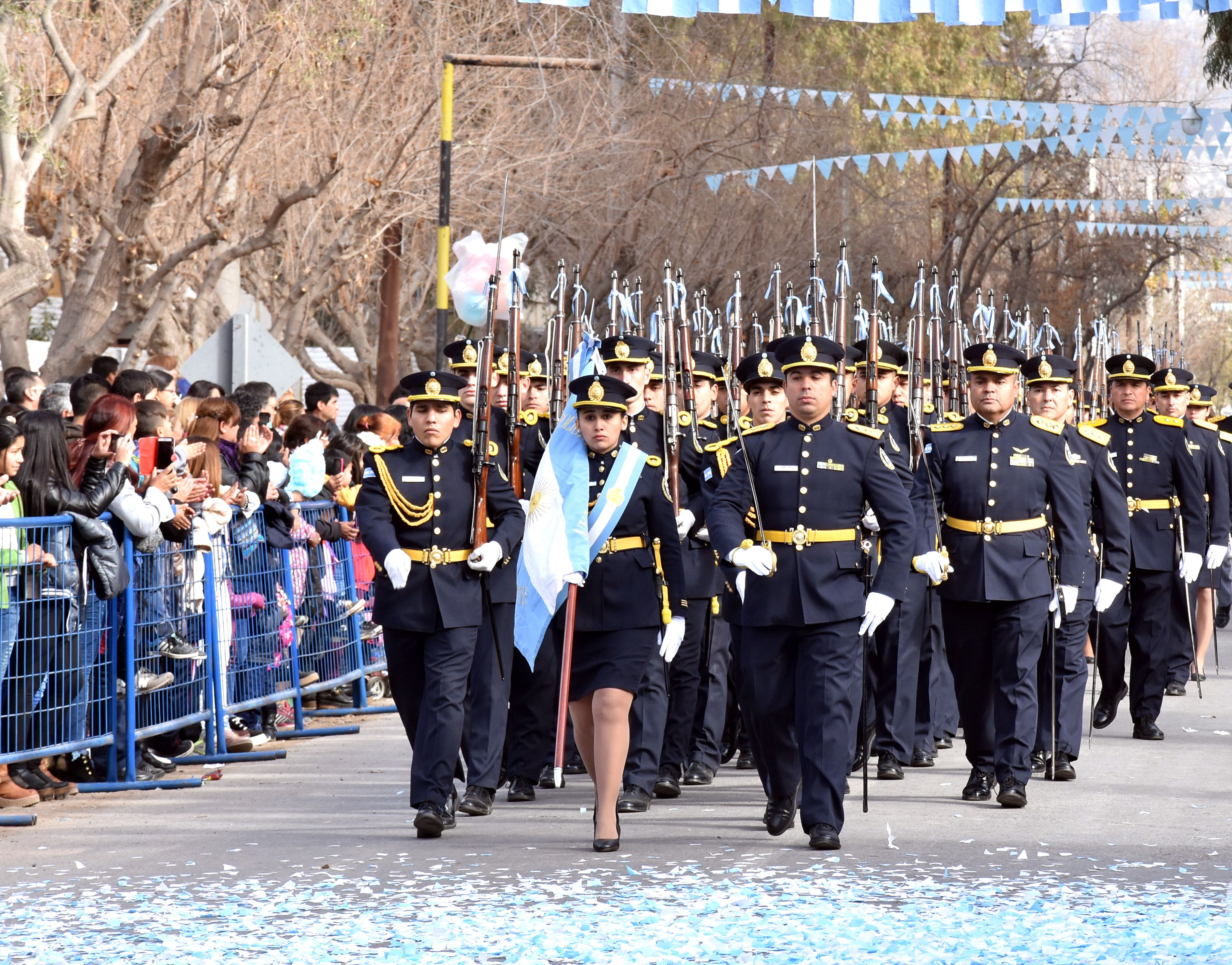 Los miembros de las Fuerzas Armadas y de Seguridad deslumbraron al público con su paso. Desfilaron efectivos de la Policía Federal, de la de San Juan, Gendarmería, Servicio Penitenciario y soldados del DIM 22.