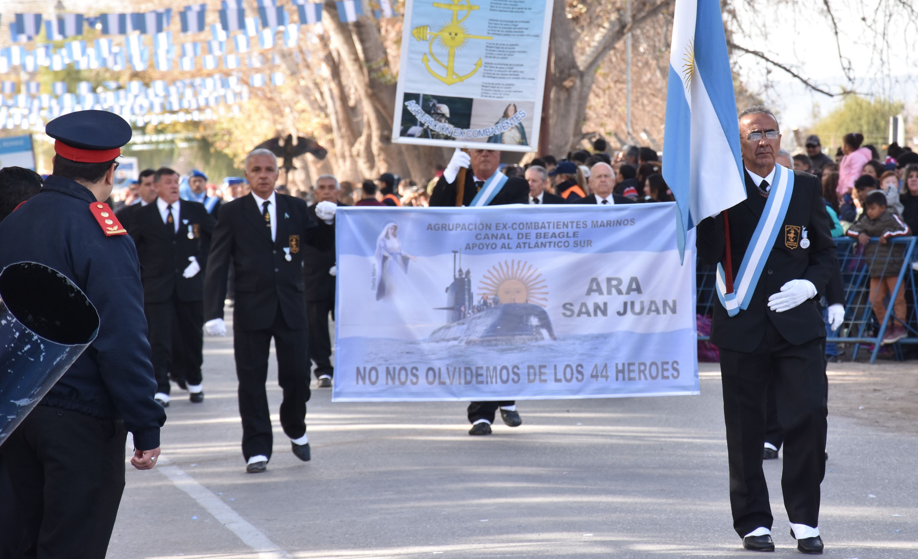 Daniel Albarracín, uno de los exmarinos, dijo que la idea de rendirle homenaje a los tripulantes del ARA San Juan tiene como objetivo no sólo mantener vivo su recuerdo, sino también bregar para que no pare su búsqueda. "Pensamos que con este pequeño detalle de desfilar con una bandera en su honor podríamos llevar alivio y esperanza a los familiares de los 44 tripulantes desaparecidos. Todos los integrantes de la agrupación estuvimos de acuerdo en hacer esta bandera en su honor", dijo Albarracín.