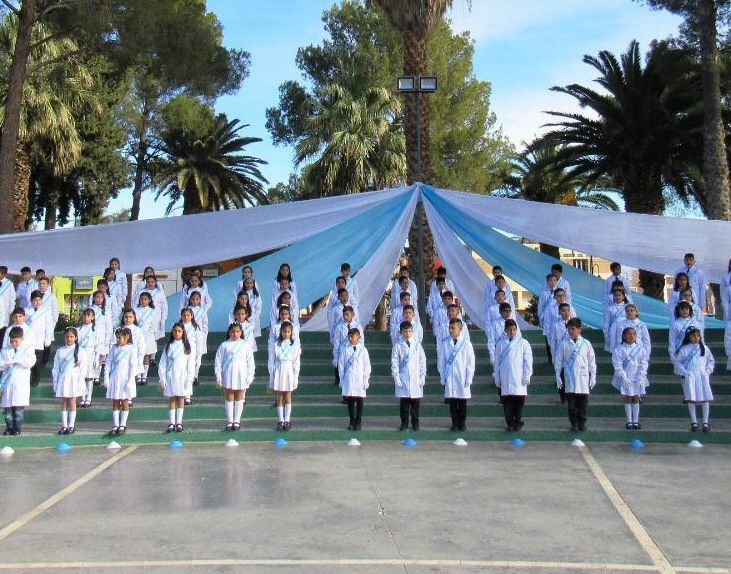 Los alumnos de 4to grado que asisten a las escuelas que funcionan en Jáchal prometieron lealtad a la Bandera en la plaza principal del departamento donde se formó un estandarte con cintas albicelestes.