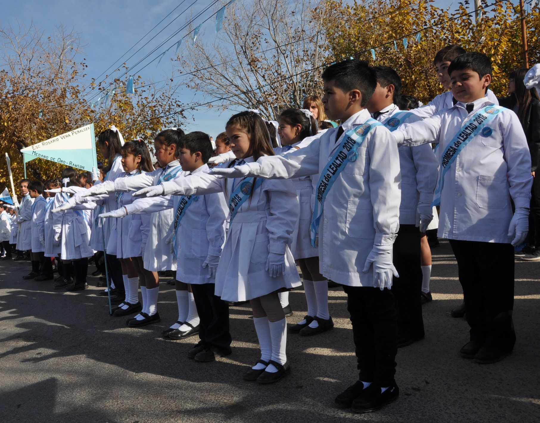 Alumnos de 4to grado de 8 de las escuelas de Rawson prometieron lealtad a la Bandera en la Plaza Eduardo Bustelo del Barrio Jorge Luis Borges. El resto lo hará en días sucesivos.