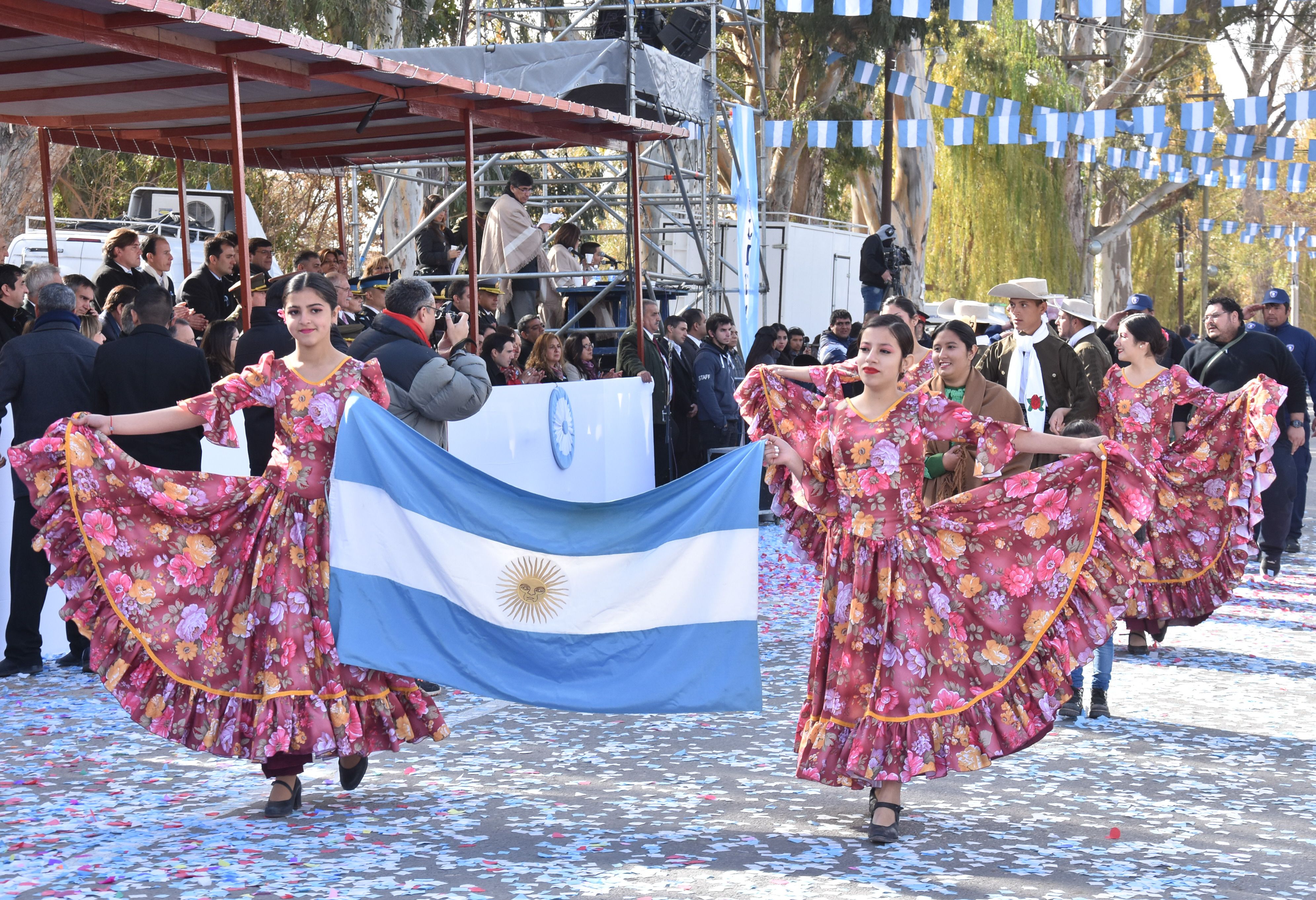 Con sentir nacional. Los integrantes de las academias de danzas folclóricas de Ullum desfilaron portando una Bandera Argentina.