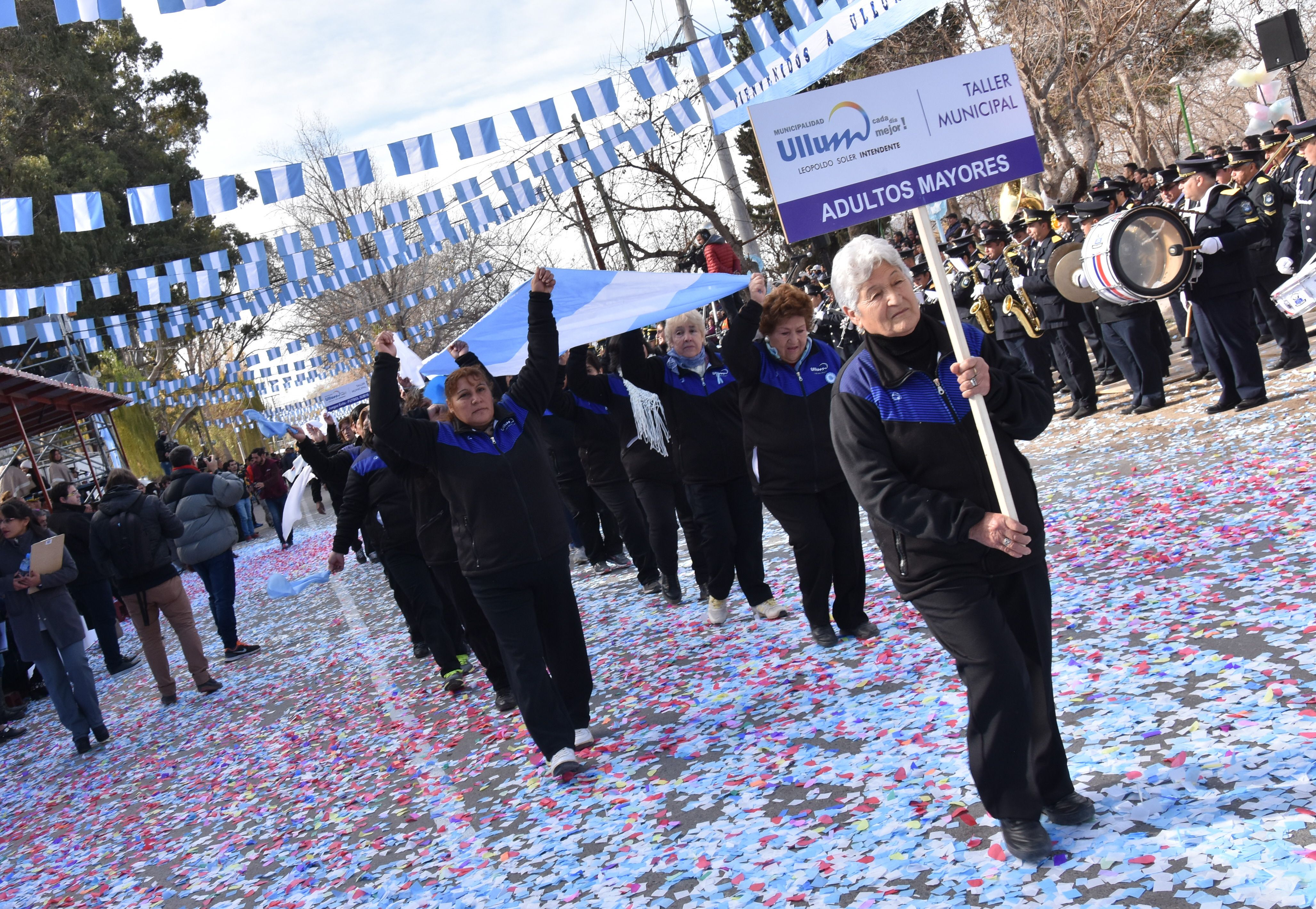 Embanderados. Los adultos mayores del departamento también portaron una larga bandera albiceleste, bajo de la cual desfilaron.