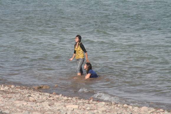 Algunas chicas sólo iban a meter los pies al agua y se metieron enteras. Otros sólo entraron para refrescarse. Con el lago hasta las rodillas varios se salpicaban y reían escupiendo el agua que se arrojaban. Esto pasó ayer en el Dique de Ullum, en las playas de la Universidad y de Palmar del Lago, antes de que el viento Sur sacara a los audaces del agua.