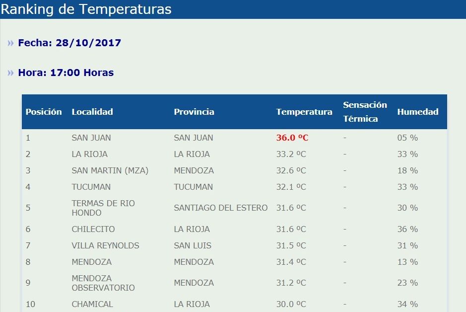 Aunque una hora después el termómetro descendió un poco, hasta los 36 grados, la provincia siguió liderando el ranking a nivel nacional. La siguieron La Rioja, con 33,2 grados, y algunas zonas de Mendoza, con 32,6.