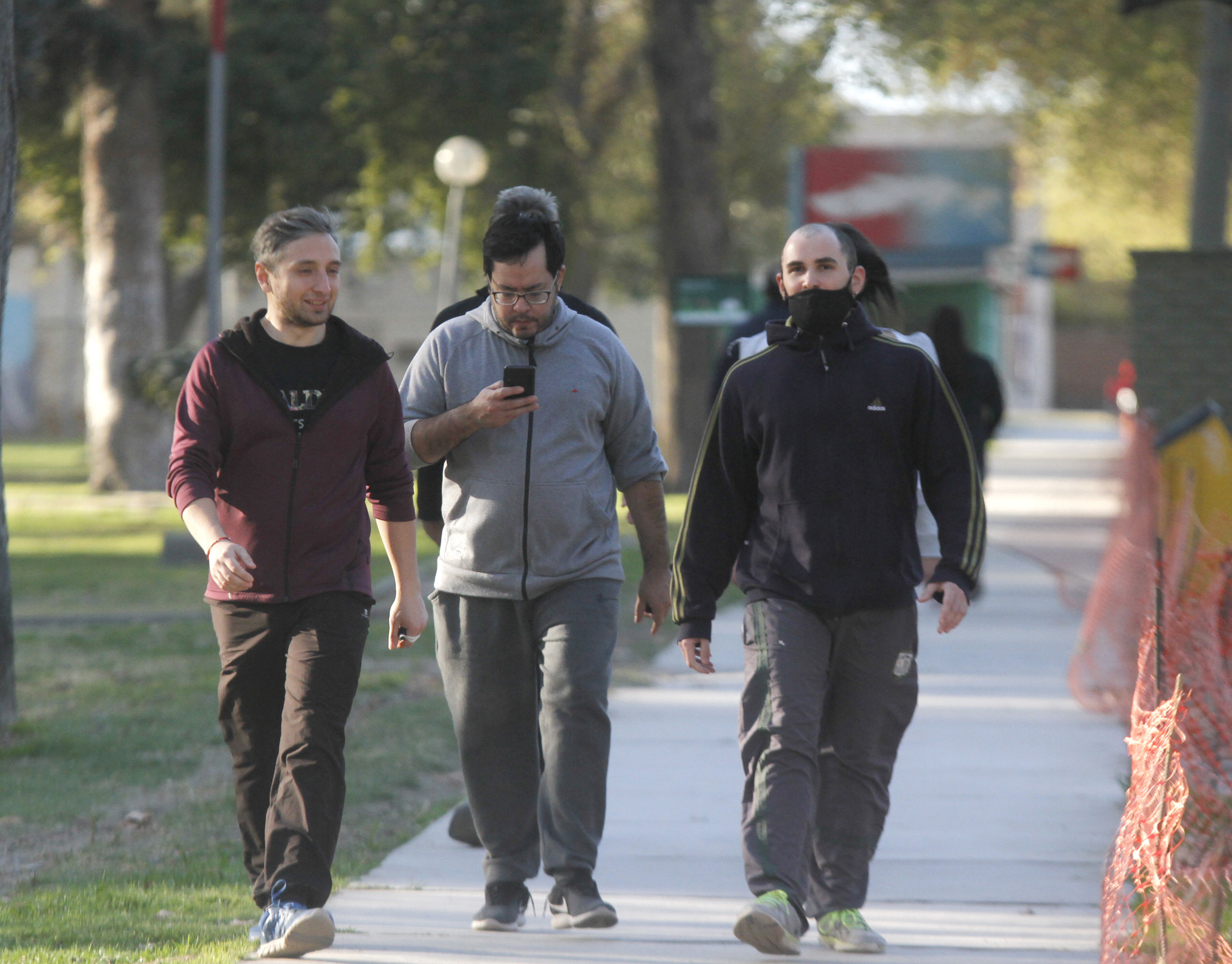 Ir en sentido de las agujas del reloj es algo que ni en la Plaza del Bicentenario ni en el Parque se respetó. Dora Flores, una mujer de 80 años quien ayer volvió a salir después de más de dos semanas, pidió por más conciencia social: "Para mí esto es volver a respirar. Caminar es salud. Pero estaría bueno que la gente entienda que nos tenemos que cuidar y que cumplan con lo que piden las autoridades", expresó, y en su pedido coincidió Leticia Moreno quien salió a caminar con su sobrino Martín Castillo. "Vas caminando y te encontrás con gente de frente porque no respetan el sentido en el que hay que caminar", se quejó la mujer. En el Parque de Mayo un grupo de jóvenes, sin tapabocas algunos de ellos, dieron cuenta de esa falta de conciencia social a la que se refirió Dora.