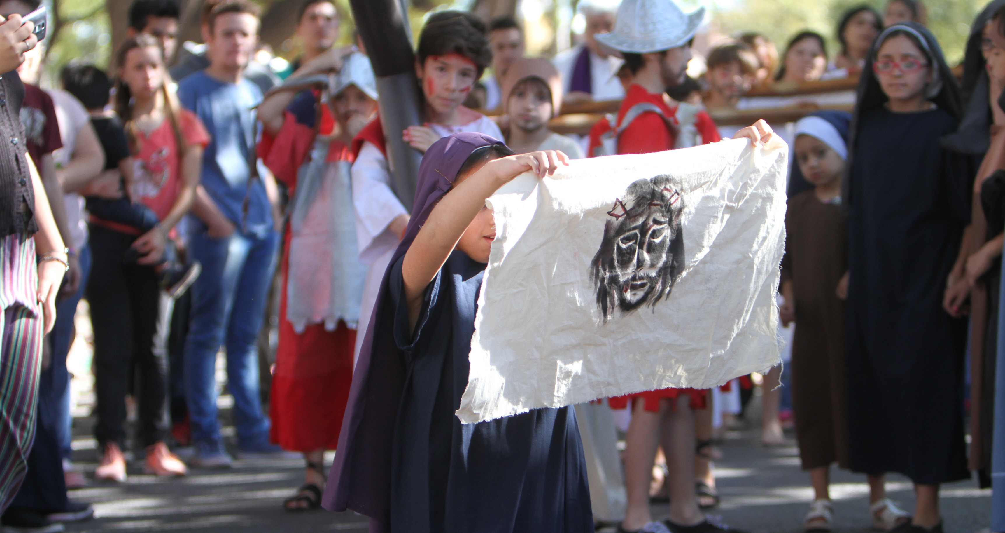 Sorpresa. Los niños espectadores se sorprendieron cuando vieron el paño con el rostro de Jesús, luego de que una mujer le secara el sudor en una de las estaciones del Vía Crucis.