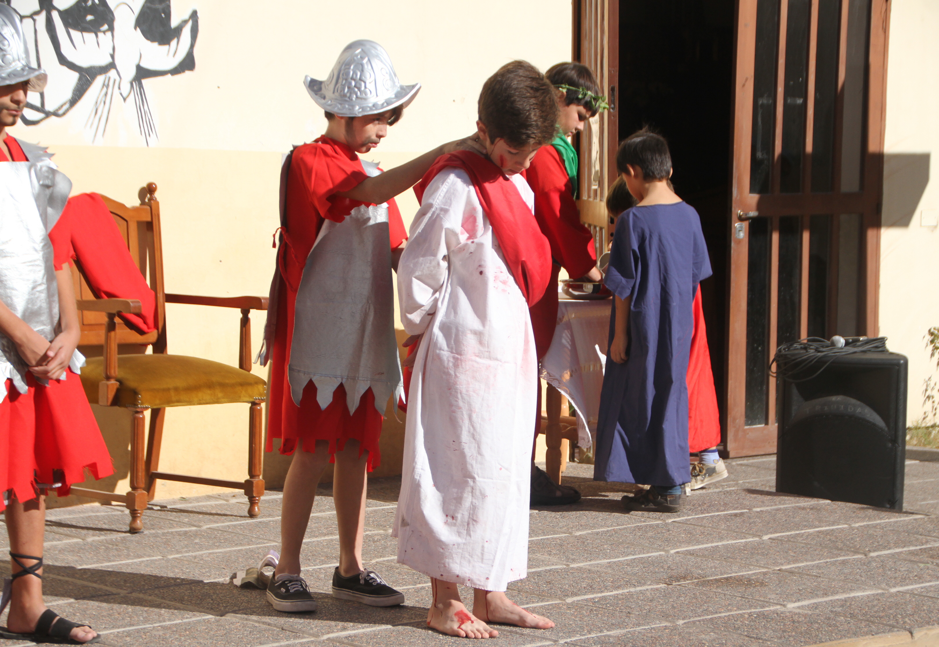 El realismo y el dramatismo se mantuvo hasta el momento de la crucifixión de Jesús, momento que los niños del público observaron en total silencio, con mucha atención y sorprendidos por el sufrimiento que demostraron los actores.