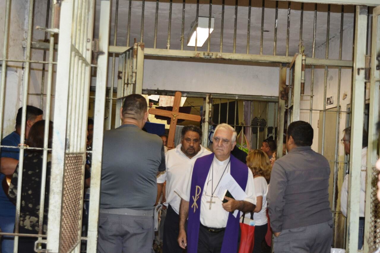 El Penal. Monseñor, Jorge Lozano, encabezó el Vía Crucis que se realizó por todos los pabellones del Penal de Chimbas, incluido el de máxima seguridad.