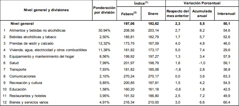 El Nivel general del Índice de Precios al Consumidor de San Juan (IPCSJ), representativo del total de hogares de la provincia, registró en el mes de febrero una variación de 2,3% con relación al mes anterior, acumulando en el primer bimestre del año una suba de 5,5%. La trayectoria interanual de este indicador se ubicó en 50,1% (-3,9 puntos porcentuales por debajo del mes anterior). Cuadro Nº1. IPCSJ según divisi