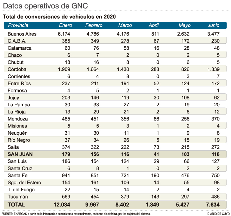 En San Juan, según datos del Ente Nacional Regulador del Gas (Enargas), hay 34.877 vehículos habilitados a usar GNC.