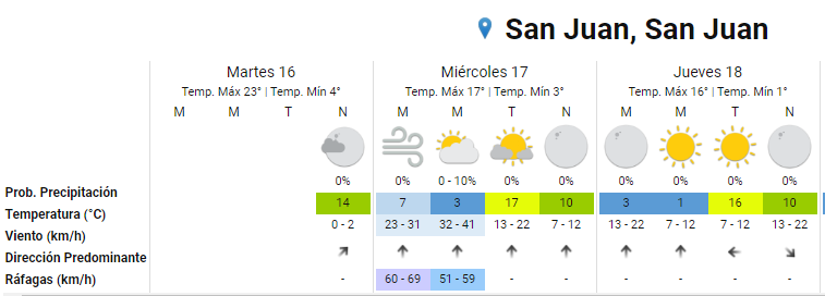 Luego del mediodía, el viento descelerará su presencia y la temperatura máxima prevista alcanzará los 17 grados. De todos modos su efecto perdurará para el jueves, con una mínima pronosticada en 3 grados y una máxima de 16.