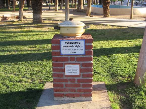 San Juan, 9 de noviembre.- "Funcionario, la cacerola vigila", dice el monumento inaugurado en Jáchal durante marzo de 2002, luego de un reclamo de casi dos meses por parte de los pobladores, que finalizó con la destitución del ex intendente Abdón Táñez.