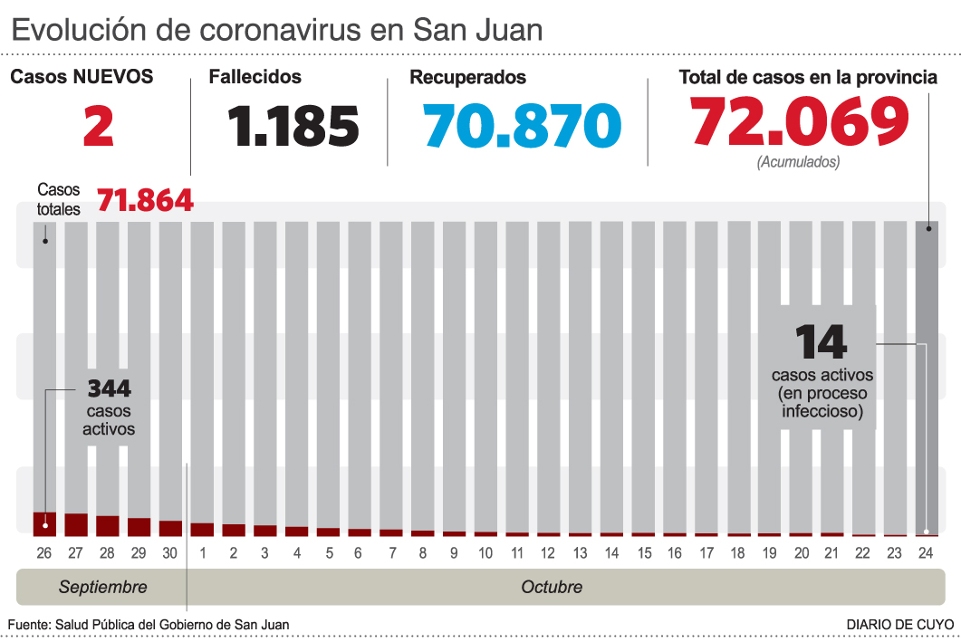 Con números sustancialmente menores a etapas previas (San Juan llegó a registrar 790 casos sólo en un día), octubre había comenzado sin sobresaltos y mostrando cifras diarias que no superan un dígito. Es más, el 4 de octubre no hubo nuevos positivos de covid luego de 412 días.