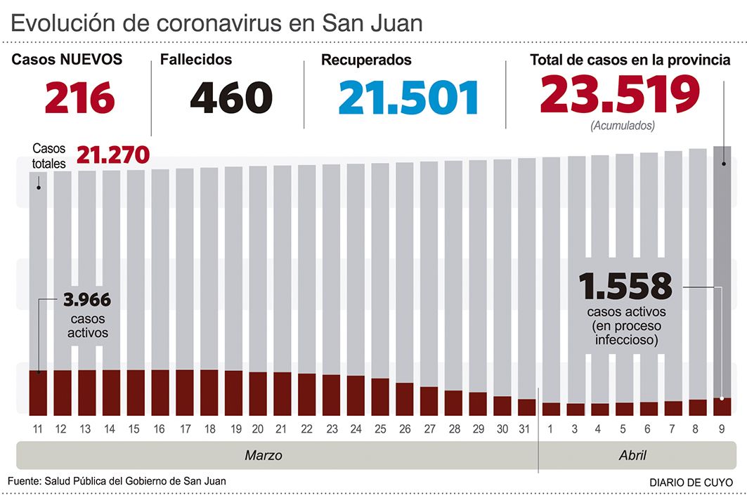 San Juan volvió a superar el récord diario de confirmaciones. Y es que si el jueves, con 200 casos, había roto una marca que se mantenía desde noviembre, los 216 positivos de ayer representan otra barrera rota. De esta manera, el acumulado de infectados es de 23.519 personas. El dato positivo es que ayer no fueron reportados decesos, que se mantienen en 460.