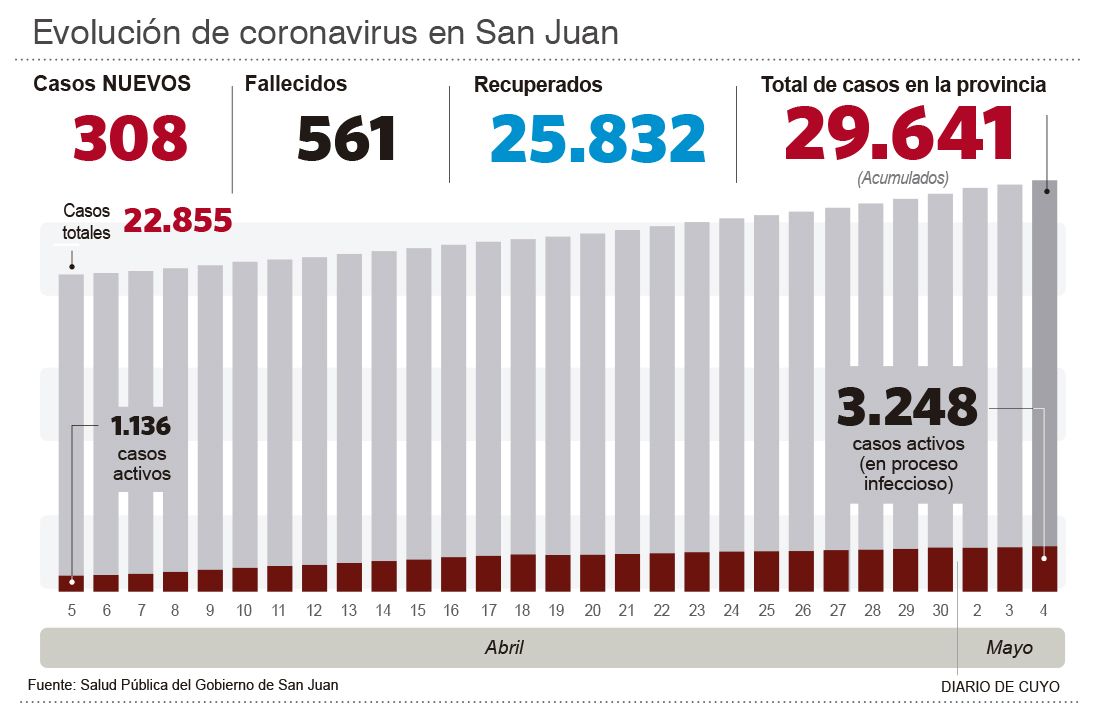 El Ministerio de Salud Pública informó ayer 308 nuevos casos de covid y cuatro fallecidos, según el parte diario. Los decesos reportados ayer corresponden a dos hombre de 70 y 64 años, ambos de Rivadavia; y a dos mujeres de 76 y 74 años, residentes en Rawson y Pocito. Con ellos, los fallecidos a causa de covid en la provincia son 561.