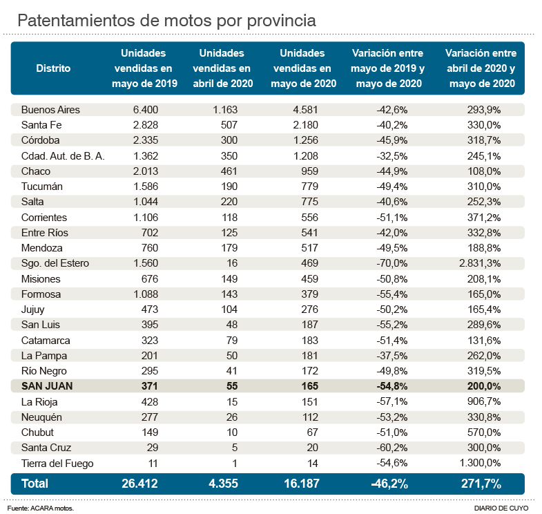 Con las puertas de los locales del rubro cerradas en abril, apenas se vendieron 55 motos en San Juan, según datos de la Asociación de Concesionarios de Automotores de la República Argentina (ACARA), pero con la reapertura de los comercios, desde el 11 de mayo, las operaciones crecieron un doscientos por ciento al trepar la cifra a 165. Los números entusiasman a los comerciantes del sector porque dicen que adquirir un motovehículo es muy buena opción de inversión al punto que las de alta gama prácticamente han desaparecido de los negocios.